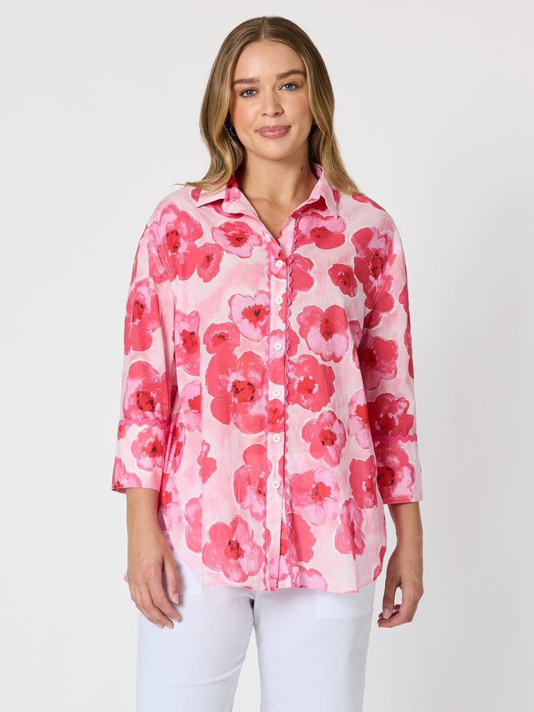 - Featuring bold painterly poppies in striking shades of pink and red, this shirt is detailed with playful ric rac trim along the placket and sleeves for a charming touch.