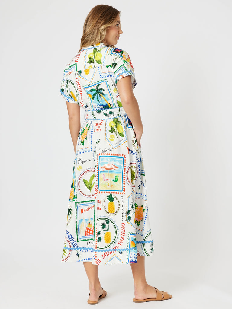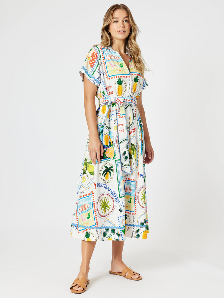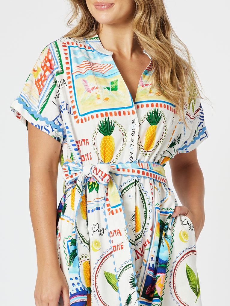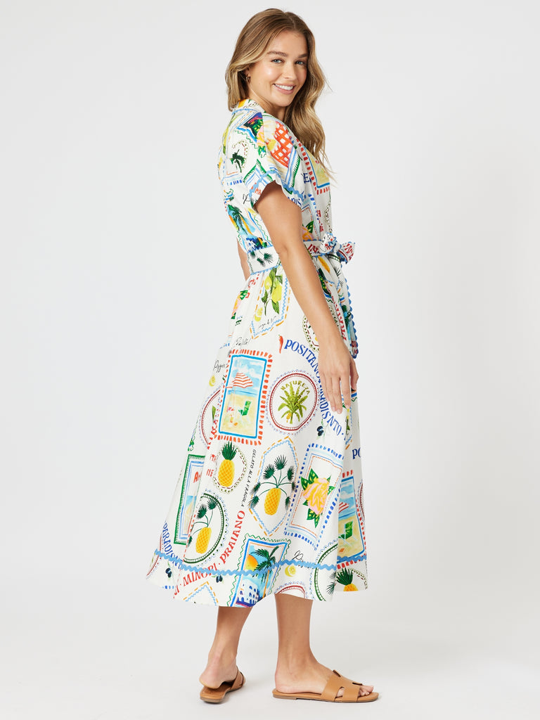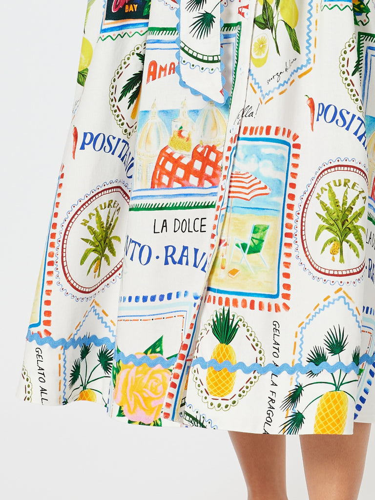 - Featuring a vibrant Amalfi Coast–inspired postcard print, this dress celebrates sunny days with playful motifs of limes, palm trees, and seaside scenes.