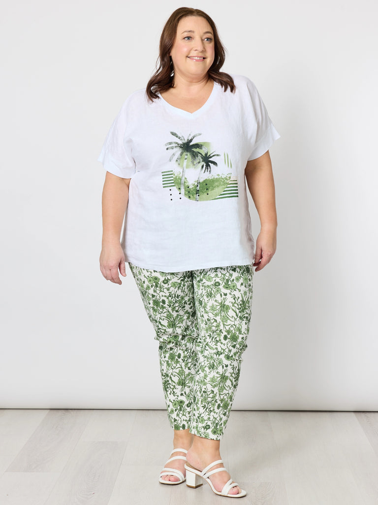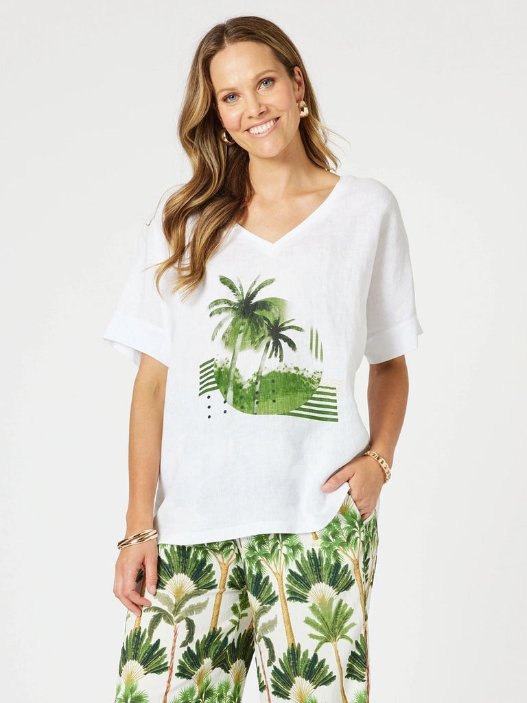 - The front panel is crafted from pure linen, showcasing a bold tropical palm print with a modern graphic overlay, while the soft cotton-blend back ensures all-day comfort and ease of movement.