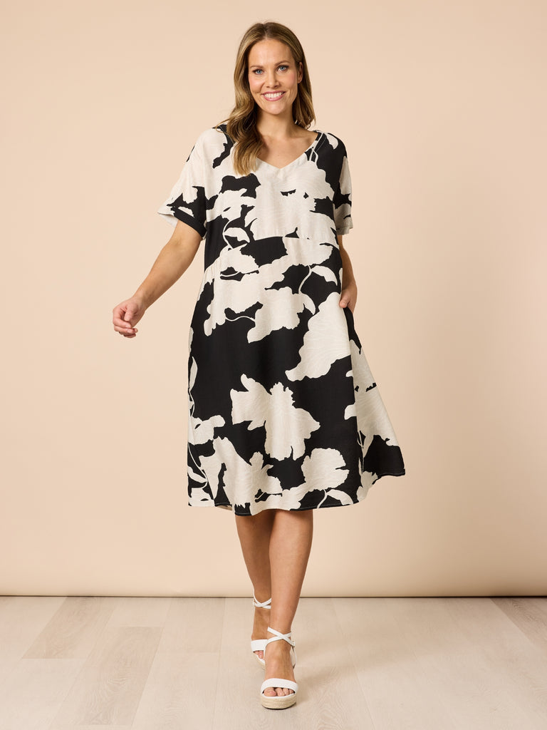 Barcelona V Neck Floral Print Dress - Black/Natural