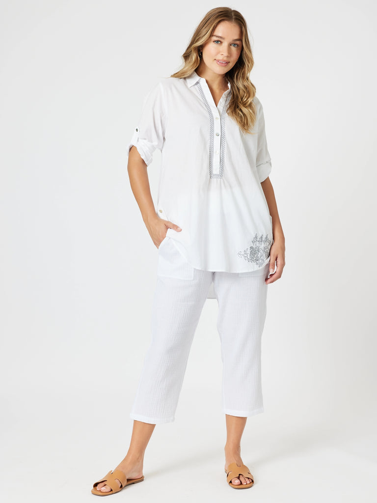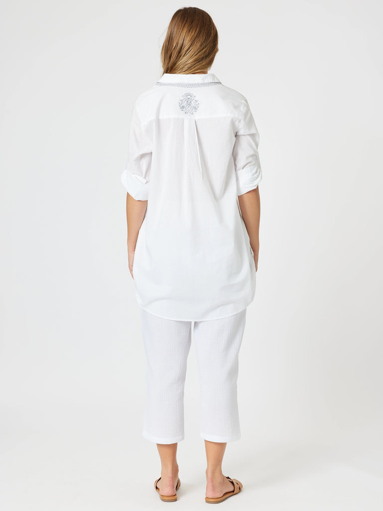 - Crafted in lightweight, sheer cotton, it features delicate embroidered details along the neckline, hem, and back yoke for a subtle yet striking finish.