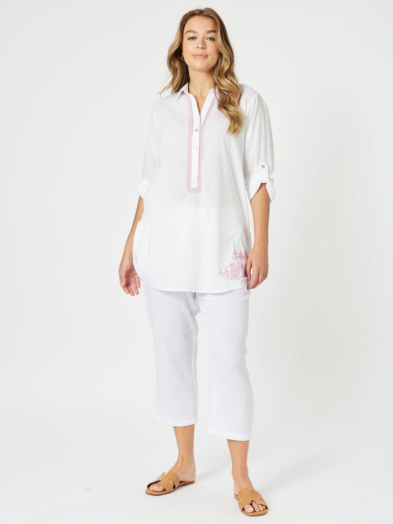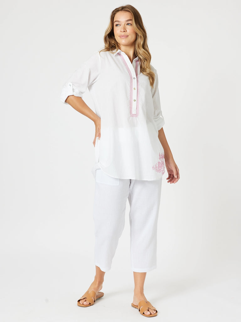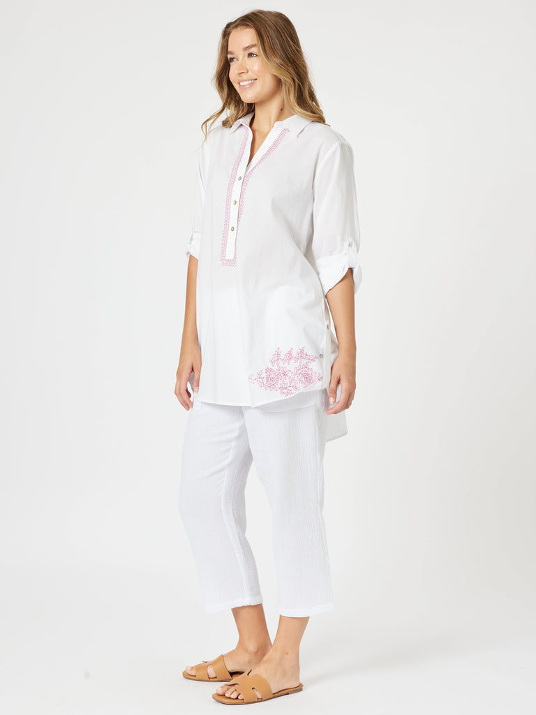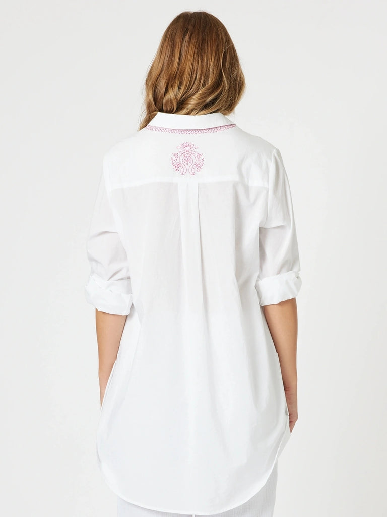 - Crafted in lightweight, sheer cotton, it features delicate embroidered details along the neckline, hem, and back yoke for a subtle yet striking finish.