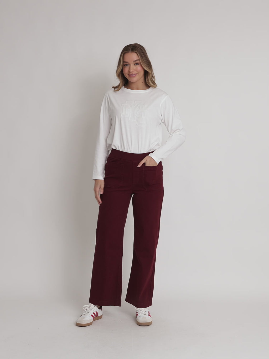 - The wide leg silhouette offers a modern, relaxed fit, and the front pockets add both function and casual style.