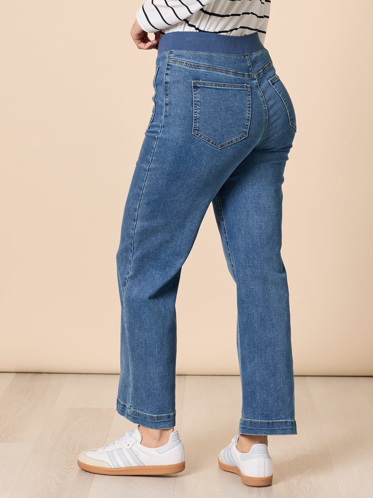 - Feel confident and comfortable in the Carpenter Stretch Wide Leg Pull-On Denim Jean.
