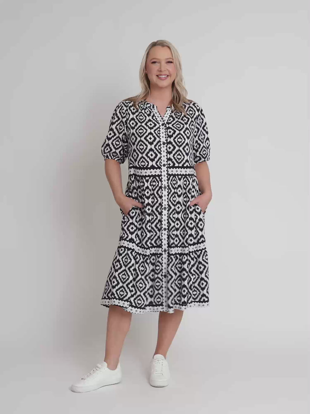 - Turn heads in the Diamonds Are Forever Tiered Dress, featuring a bold navy and white geometric print that exudes timeless style.
