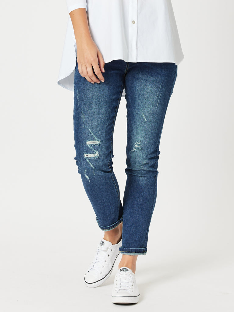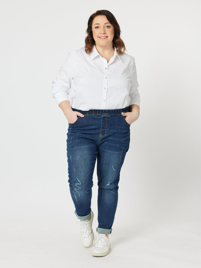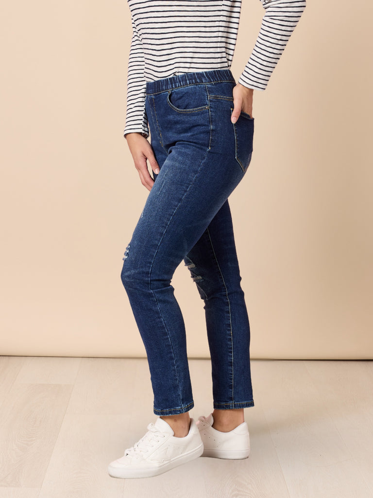 LA Distressed Pull On Stretch Denim Jean - Dark Denim