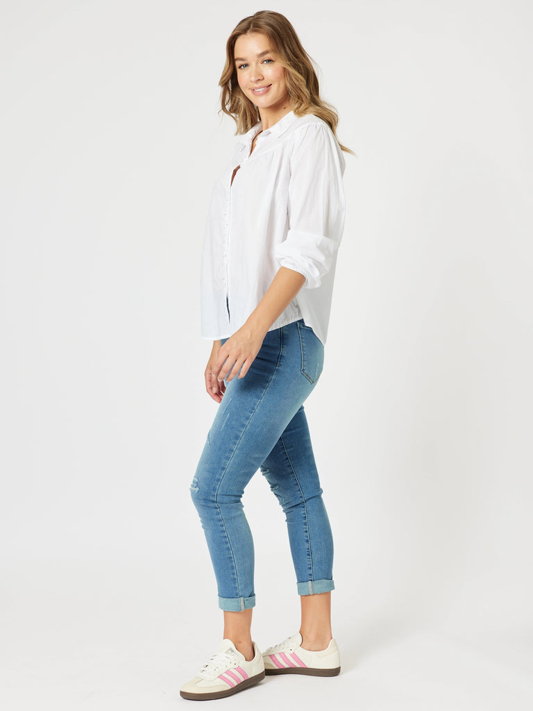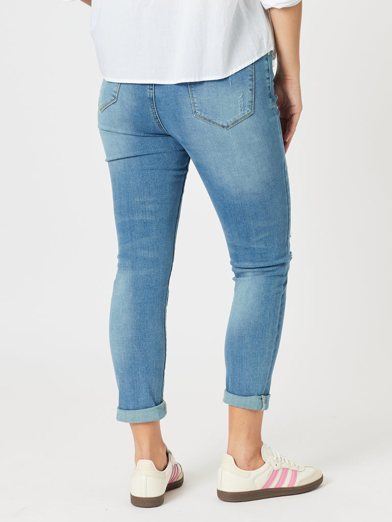 Crafted from a super stretchy denim fabric with an encased elastic waistband that gives you 10/10 all day comfort