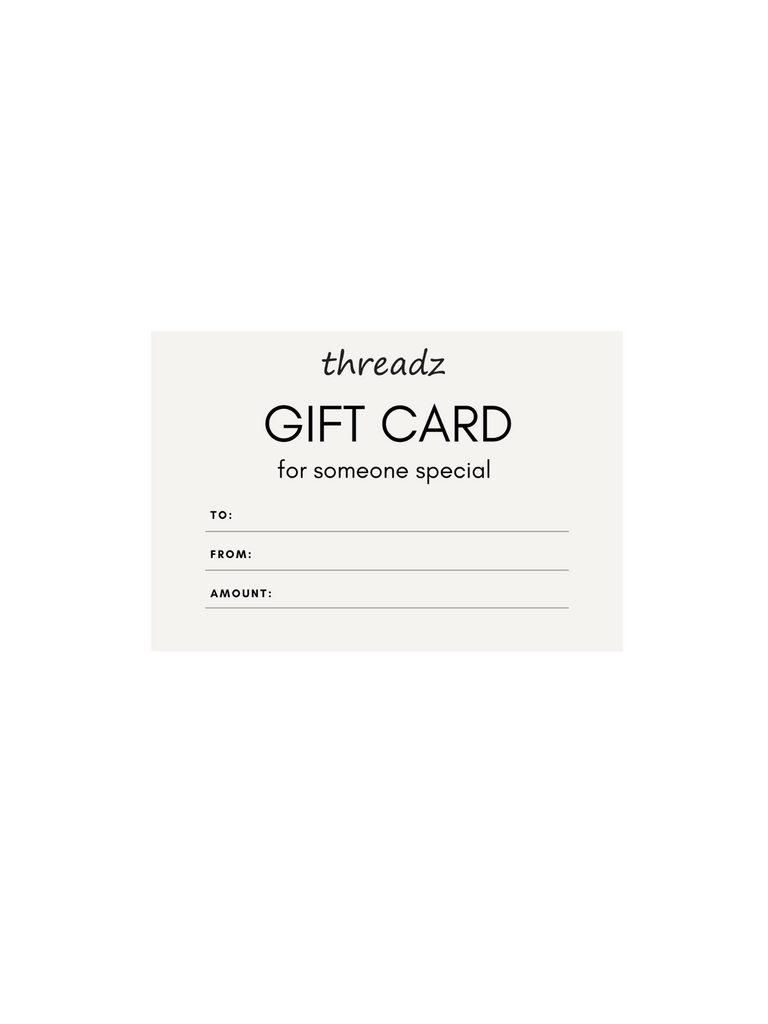 Shopping for someone else but not sure what to give them? Give them the gift of choice with a Threadz Gift Card. Just choose your Gift Card amount, add to bag and you're done - gifts made easy! Our Virtual Gift Cards are delivered instantly by email and contain instructions on how to redeem them at checkout.