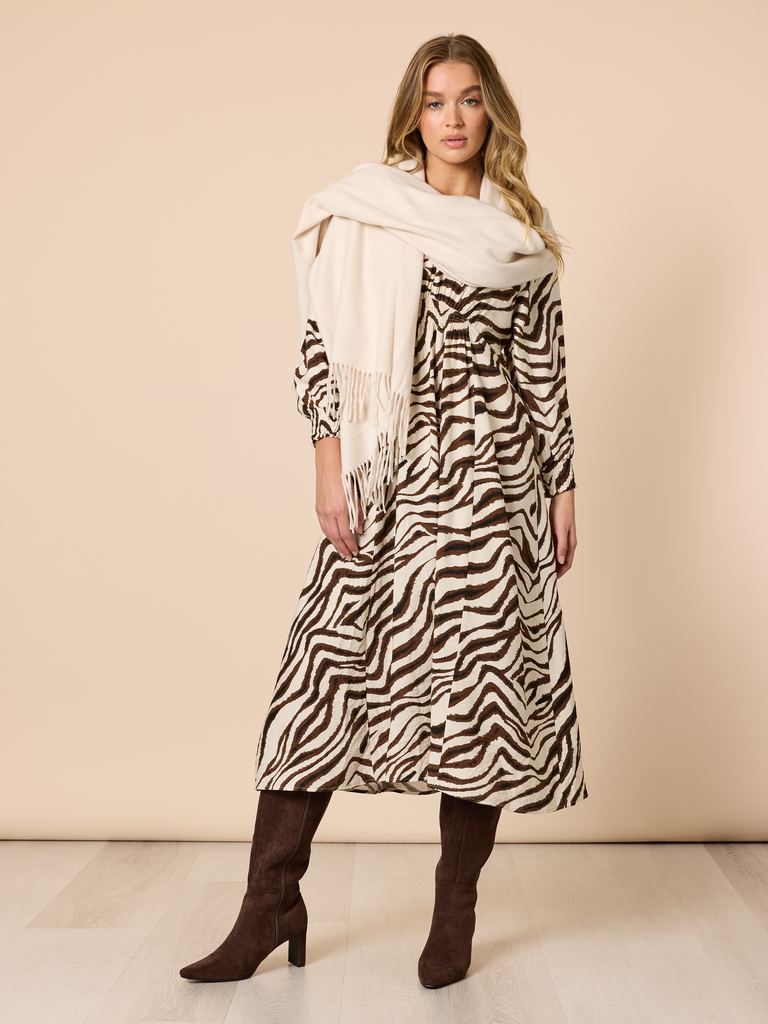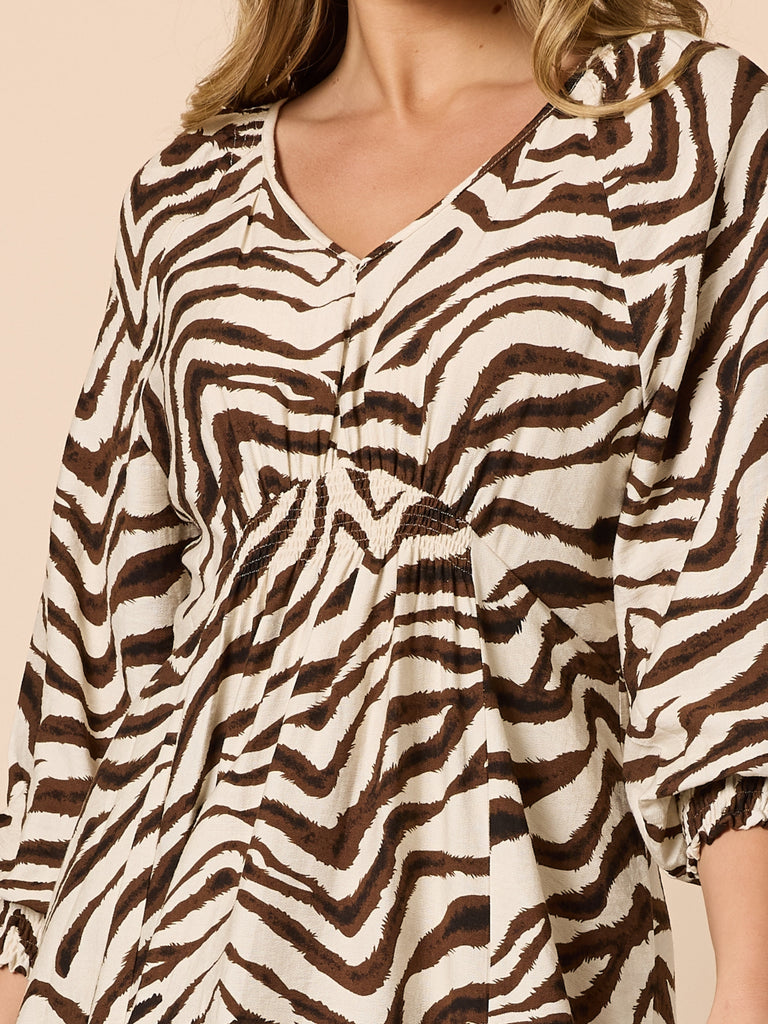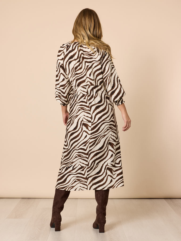 - Featuring an eye-catching zebra-inspired print, this dress blends neutral tones with striking pattern work to create a look that stands out while remaining timeless.