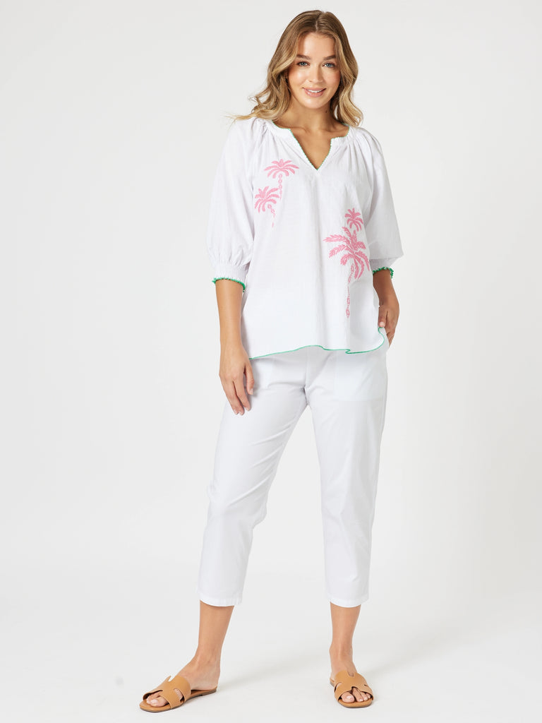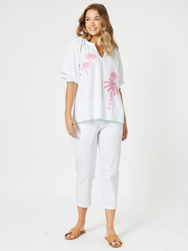 - Crafted from softly textured lightweight 100% cotton, this crisp white top features pink embroidered palm motifs on the front for a playful pop of colour.
