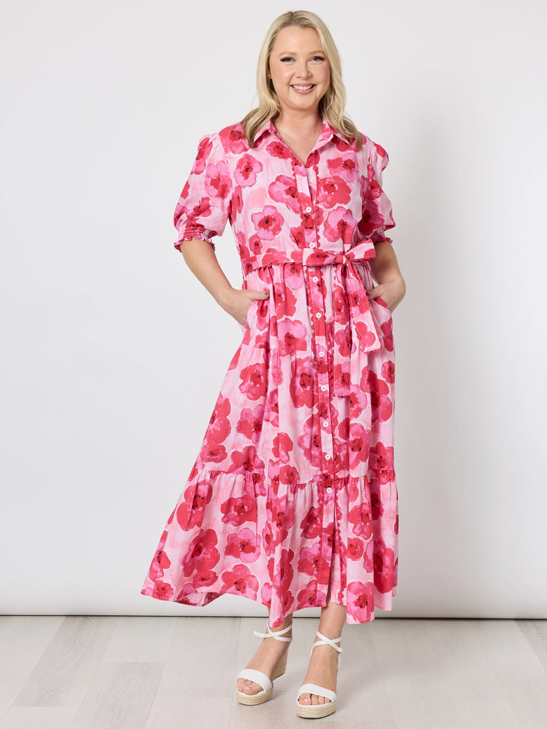 - Showcasing a vibrant pink poppy print on a soft blush base, this dress features a classic shirt collar, button-through front with ric rac trim, and short puff sleeves with gathered cuffs for a feminine touch.