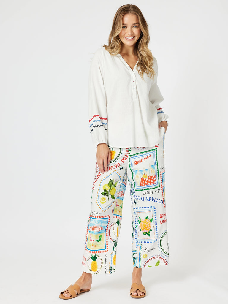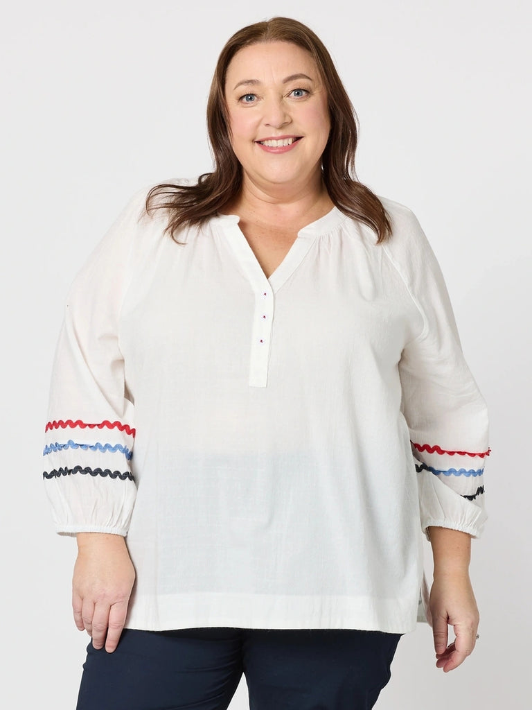 - Crafted from soft, breathable cotton, this white tunic is elevated with ric rac trim detailing in red, blue, and black along the sleeves, adding a fun pop of colour and texture.