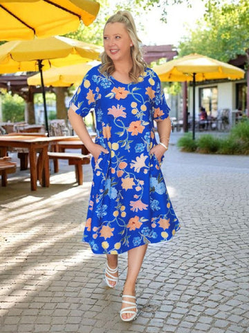 - Featuring a striking blue backdrop adorned with vibrant florals in shades of peach, yellow, and soft blue, this dress offers a cheerful yet sophisticated look.